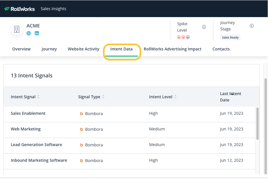 On the sales side of a system like RollWorks, we can display intent data, website activity, journey stages, and more on the account level for easier prospecting. BDRs can then pull this information into their sales enablement efforts to reach accounts with relevant resources at the right moment.